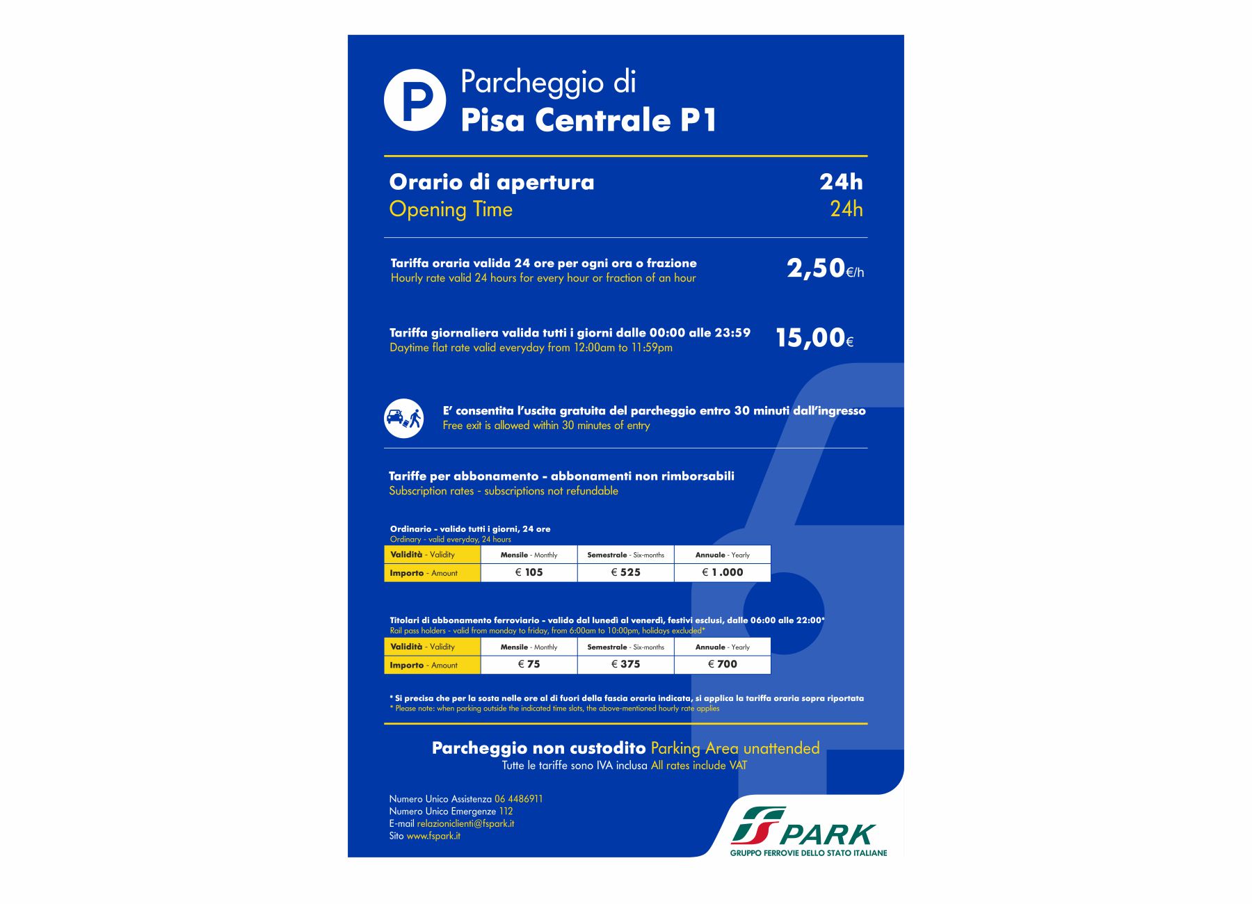 FS PARK informa che dal giorno 01/03/2024 entreranno in vigore le nuove tariffe del parcheggio di Pisa Centrale P1.
