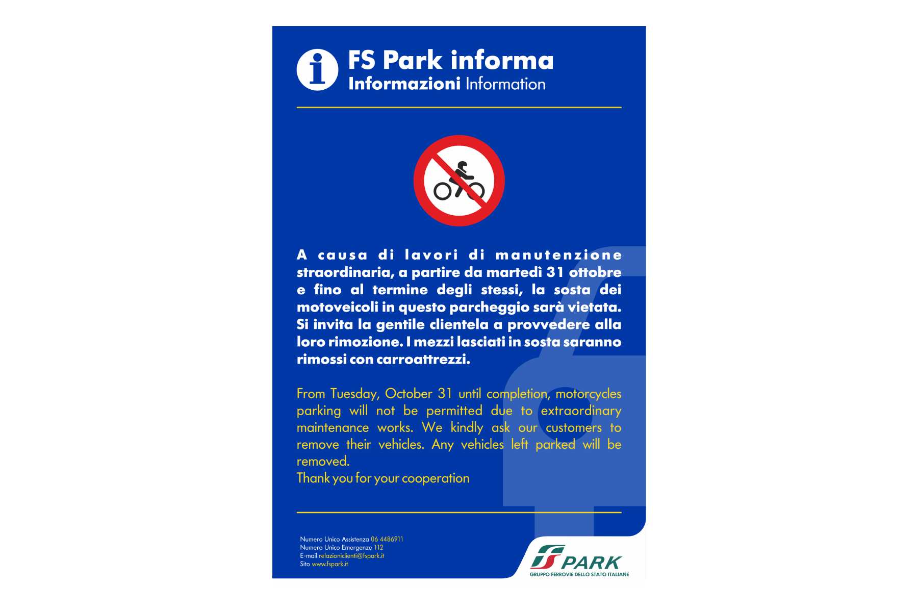 FS PARK informa che nel parcheggio di Milano Porta Genova, a causa di lavori di manutenzione straordinaria, a partire da martedì 31 ottobre e fino al termine degli stessi, la sosta dei motoveicoli in questo parcheggio sarà vietata. Si invita la gentile clientela a provvedere alla loro rimozione. I mezzi lasciati in sosta saranno rimossi con carroattrezzi.