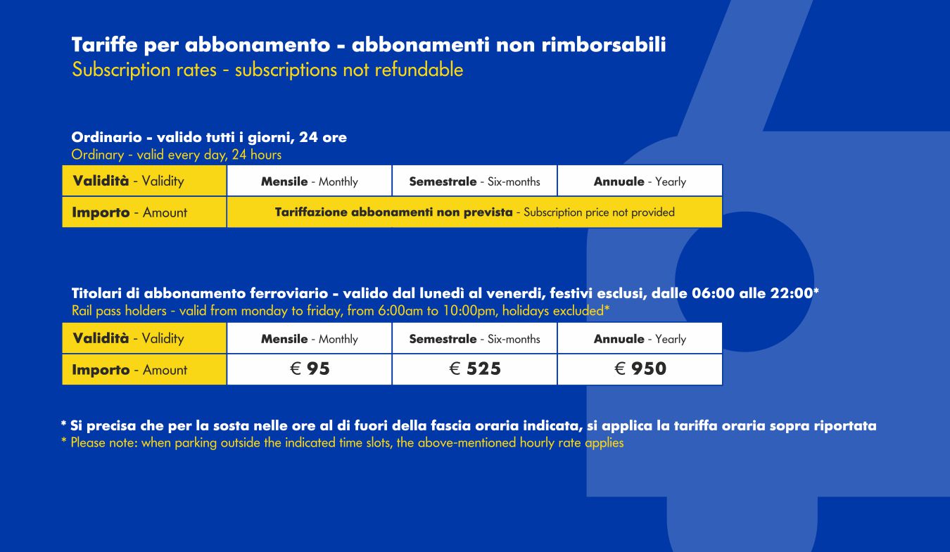- È possibile sottoscrivere il contratto di abbonamento all’interno del parcheggio e ritirare la tessera di abbonamento nelle date opportunamente comunicate.
