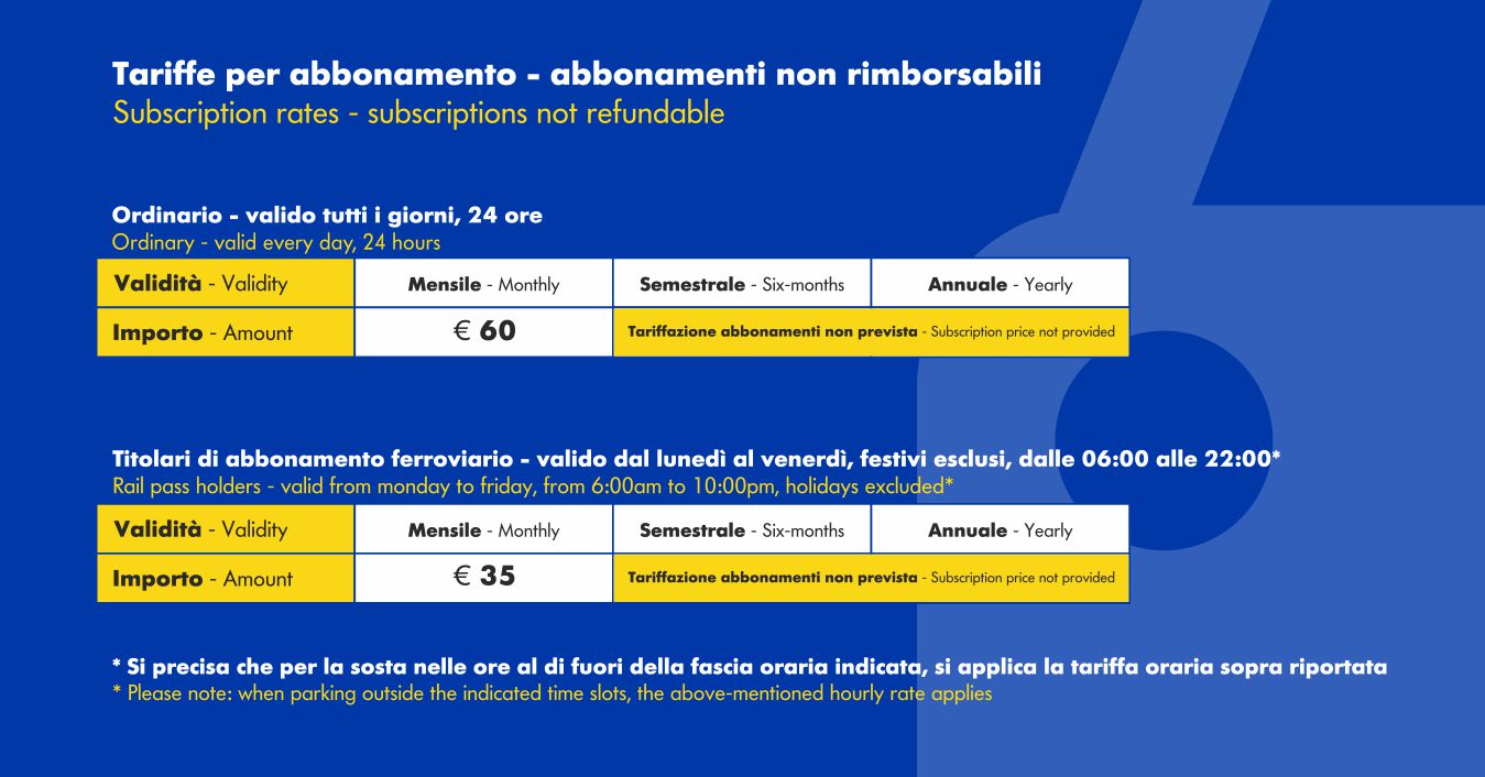 - Il numero di abbonamenti è condizionato alla capacità del parcheggio e in caso di richiesta superiore al numero massimo concesso è prevista una lista d’attesa in ordine di arrivo